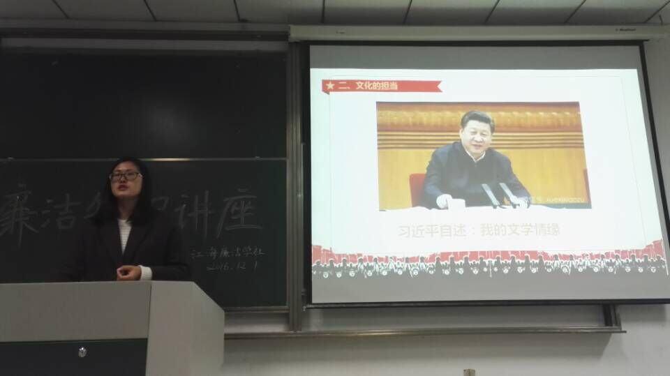 张馨老师以“说说廉洁那些事儿”为题,讲座从时代的呼唤、文化的担当、信仰的光芒、习惯的力量四个方面展开。讲座伊始,老师从时代的呼唤这一角度,详细讲述了“两学一做”,学习共产党党章党规,学习贯彻习近平总书记系列重要讲话精神,做合格党员。并联系现实与同学们讨论了中国当今的反腐工作以及美国大选记票问题和韩国总统朴槿惠亲信干政问题。谈到文化的担当,张老师讲解了毛泽东的《改西乡隆盛诗赠父亲》,并讲述了习近平的自述《我的文学情缘》。从领导人出发,看他们如何担当起时代的文化。接着,在习惯的力量这一方面老师希望同学们能做到独立思考,认真读书,学会自律,最终学会孤独,达到一种自成体系的状态。在听讲座过程中,同学们认真聆听并做好笔记。最后,活动在热烈的掌声中结束。