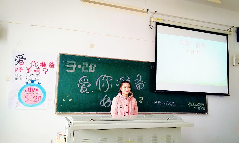 为积极响应大学生心理协会3.20主题活动——“爱,你准备好了吗?”,马克思主义学院政教151班于3月17日在3号楼405室开展了“爱的剪影”主题班会活动。旨在解决大学生恋爱心理问题,同时分享一些恋爱、友爱、关爱的故事,加强大家对于“爱”的理解。