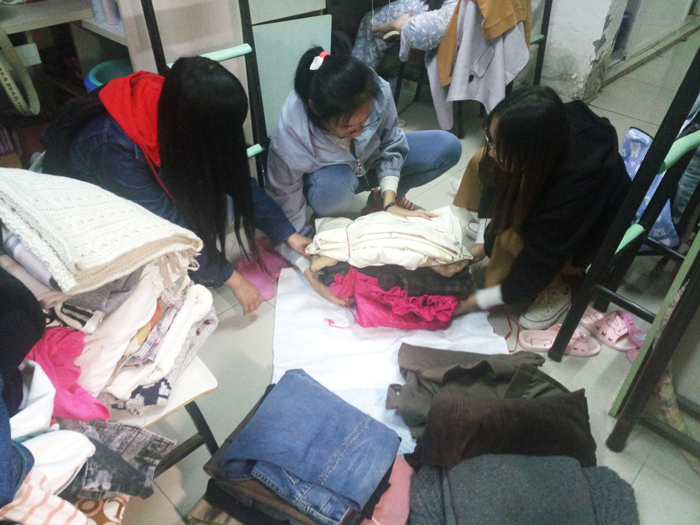 本次活动分三天,三个小组依次进行。第一组主要负责募集大二与大三的衣物,第二组主要负责大一与大四的衣物,第三组主要负责研究生的衣物。到达宿舍收集衣物时,同学们都很热情地欢迎马院莫莫们的到来,并尽可能献出自己的一份爱心。在进行了一系列的捆扎打包后,马院莫文隋志愿者们将几麻袋的衣物送至二食堂摊点。