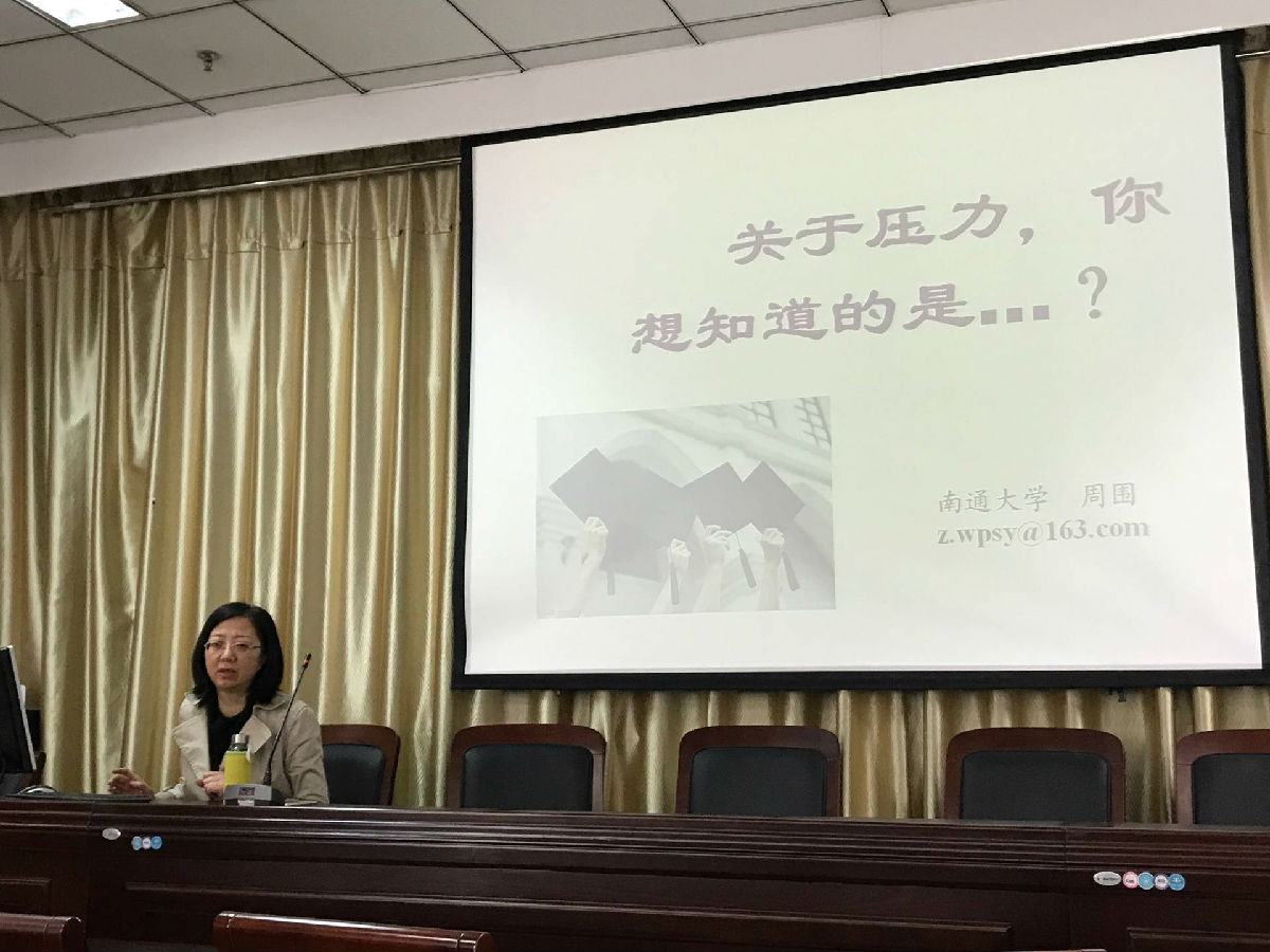 压力是我们日常学习生活中常常听到的一个词,压力太大会让我们失眠、焦虑、逻辑混乱,甚至危害到我们的生命健康和家庭幸福。想要在压力下健康地成长,最主要的是正确地认识压力。讲座一开始,周围老师先对同学们进行提问,对于压力这一话题,同学们对哪些方面感兴趣。同学们积极回答,有的说如何缓解压力,有的说当代就业的压力。随后周围老师深入地分析了压力的类型,适度压力的重要性。老师点明:过度压力让人疲乏,降低工作效率;过少压力则会让人显得松散。这启示我们应该保持适度的压力,不宜过度紧张也不宜过度松懈。