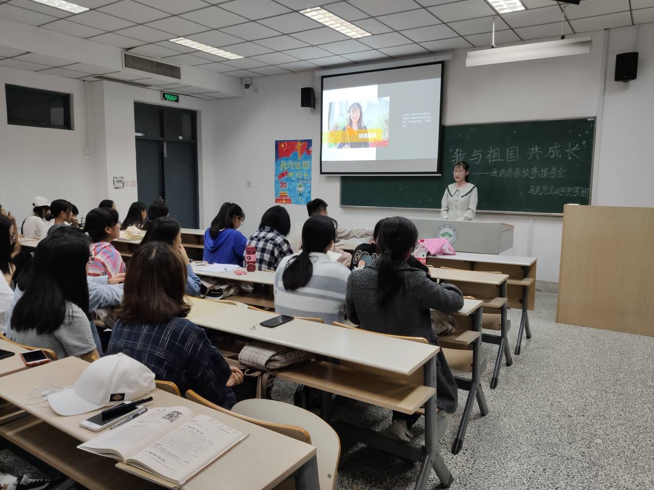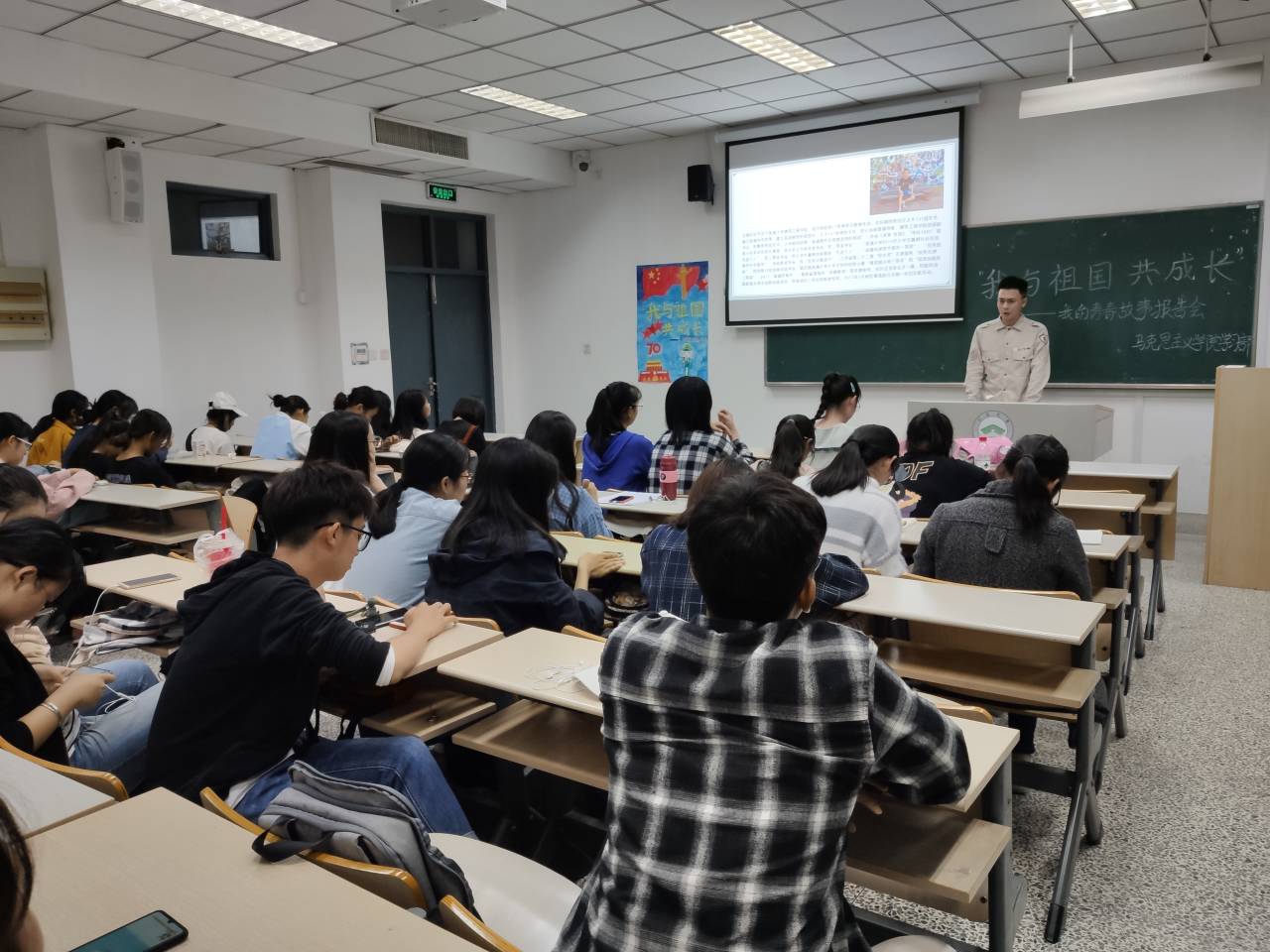 10月9号晚,马克思主义学院学习部举办的“我与祖国共成长”——我的青春故事报告会在8号楼405召开。马克思主义学院研三学生王健、研二学生任胜男作为嘉宾参加,政教171班冯丹、政教181班的许晴和郑圳以及全体大一学生参加活动,本次活动由周键浩主持。