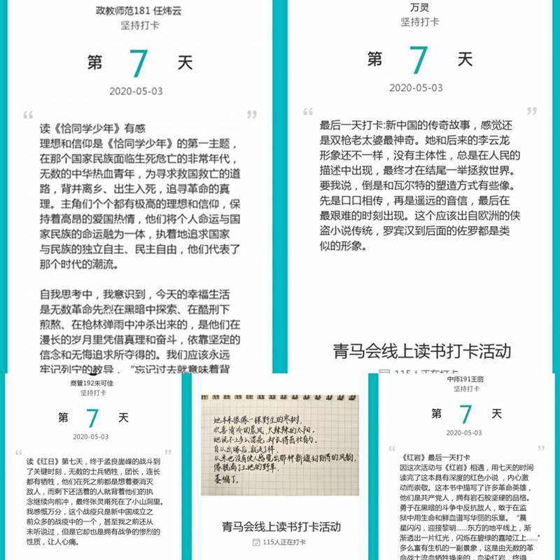 本次活动共历时七天,一经发起就吸引了上百名同学参与。为确保活动的顺利进行,青马会运用了QQ群、志愿者打卡器和小打卡程序来开展活动。此外,青马会的负责人每天都会在QQ群里为大家推荐红色经典书目,供同学们选择。同学们阅读完毕后,即可在小打卡程序里分享自己的读书感悟。截止至5月3日活动结束之时,小打卡读书圈子里共收获了583条打卡记录,跃度一度跻身为南通市第8名。