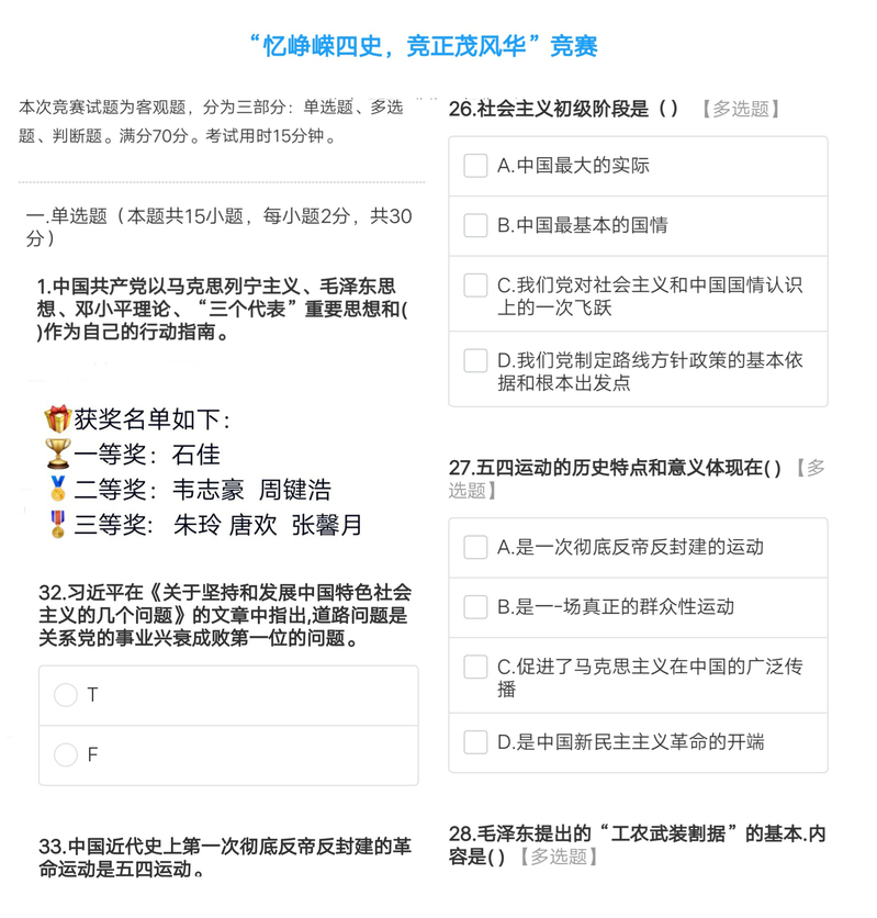 本次活动以线上形式呈现,题目分为单选题、多选题和判断题三种形式。参赛选手于于11月20日晚7点登录问卷星平台进行答题,答题完毕后问卷星平台给出试题的正确答案及解析,以便同学们进一步学习掌握,最终评选出一、二、三等奖共6人。获奖名单如下:一等奖:石佳;二等奖:韦志豪、周键浩;三等奖:朱玲、唐欢、张馨月。