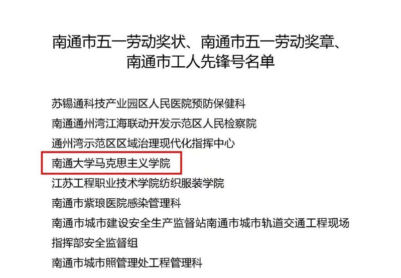 近日,南通市总工会印发《关于命名南通市五一劳动奖状奖章和南通市工人先锋号的决定》,我校马克思主义学院获评“南通市工人先锋号”。