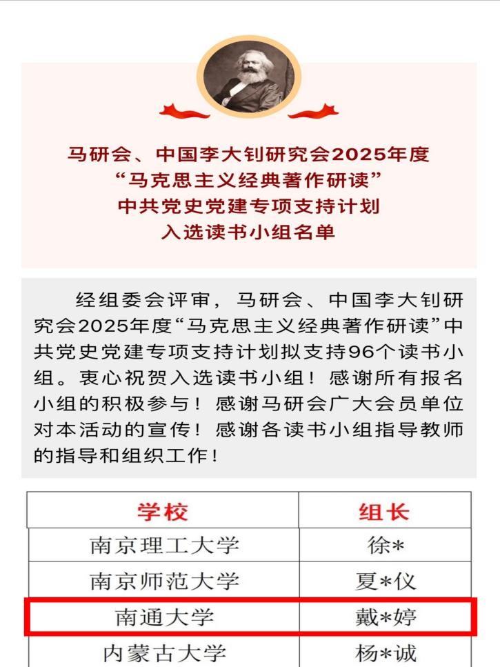 近日,中国高等教育学会马克思主义研究分会、中国李大钊研究会2025年度“马克思主义经典著作研读”中共党史党建专项支持计划名单公布。南通大学《毛泽东选集》读书小组在此次全国各高校的评选中脱颖而出,成为南通大学第二次入选马研会“马克思主义经典著作研读”资助计划的读书小组。此次全国共有96个读书小组获得立项资助,江苏省有南京大学、东南大学等6所高校的读书小组名列其中。