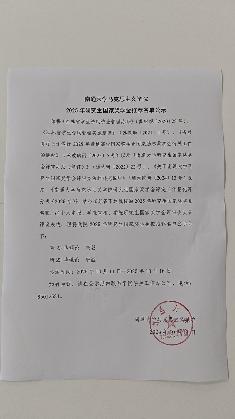 南通大学马克思主义学院2025年研究生国家奖学金推荐名单公示