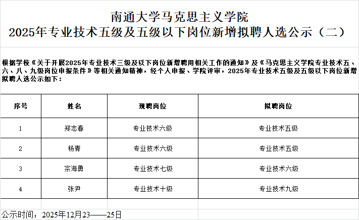 南通大学马克思主义学院2025年专业技术五级及五级以下岗位新增拟聘人选公示(二)